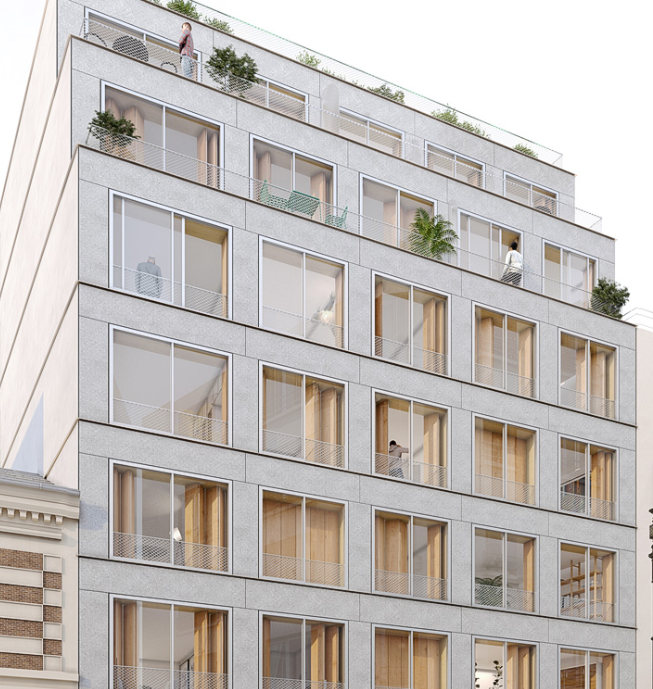 На фотографии один из примеров облицовки уже готового объекта в Санкт-Петербурге (ЖК на набКарповки, 31).